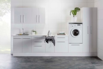 Møblene er designet med fokus på praktiske løsninger: integrert skittentøyskurv, uttrekkbart strykebrett, avlastningsbrett og god plass til oppbevaring av vaskemidler. Skapene leveres ferdig montert med ben og håndtak, og har myk-lukking som standard. Du kan velge blant ulike skapstørrelser og smarte funksjoner, enten du har stort vaskerom eller bare en liten krok tilgjengelig.
